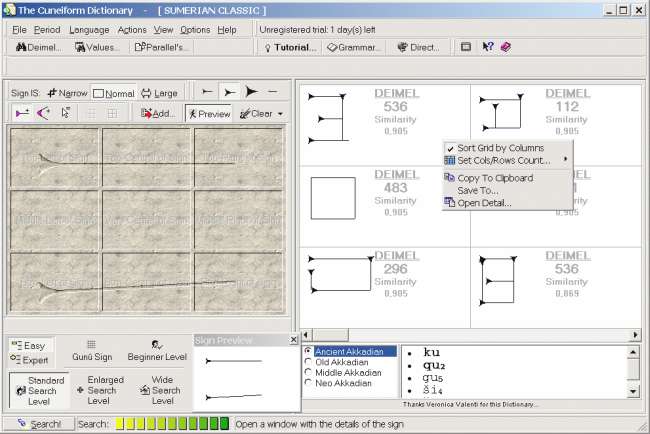 I am proud to welcome you to the first, true dictionary of Cuneiform Languages. TCD applies the power of Windows-based computers to reading ancient languages written in cuneiform signs. With TCD, you simply need to draw a partial, rough shape of the sign and that's all. As an example: my 14-year old nephew found the NI sign, copying it from a schoolbook, in 20 seconds. It was the first time he sought to use the program. With TCD you no longer need to count the wedges of a sign, judge if a wedge is before another, know the historical period of a sign, know the evolution of a sign over the centuries, etc.